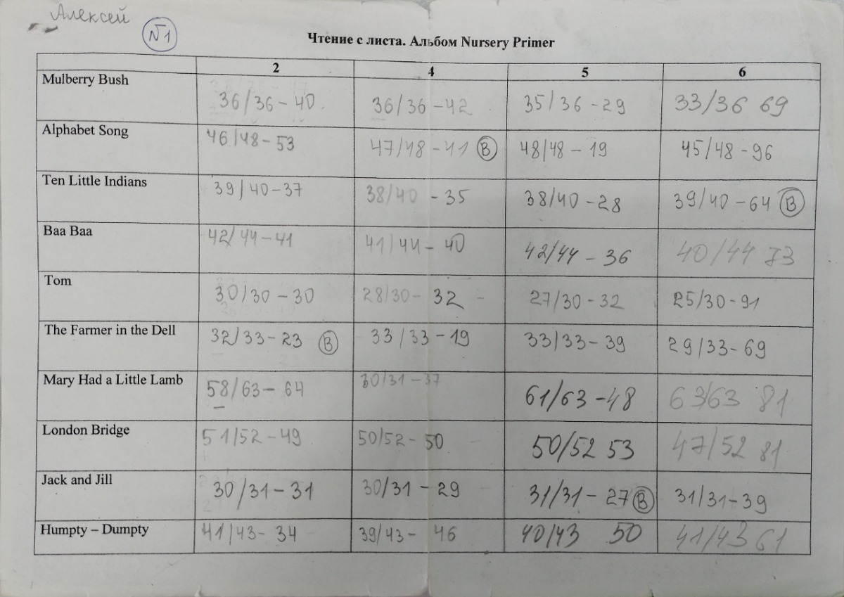 Чтение с листа альбом Nursery Primer (таблица с результатами, 4 видео)