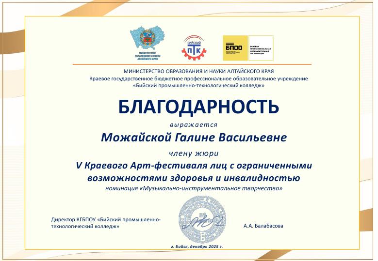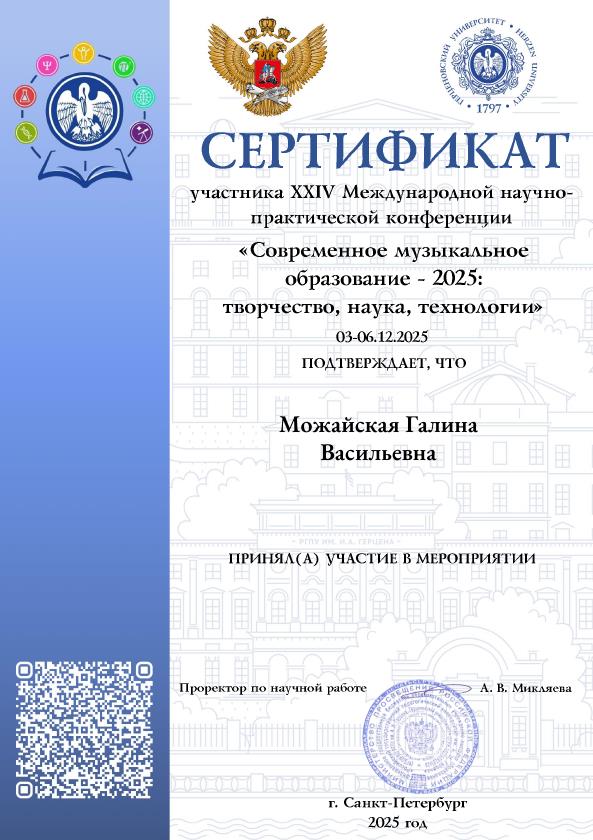 Сертификат за участие в XXIV Международной научно–практической конференции «Современное музыкальное образование – 2025: творчество, наука, технологии», организованной РГПУ им. А. И. Герцена (Санкт-Петербург) и Санкт-Петербургской государственной консерваторией им. Н. А. Римского-Корсакова.