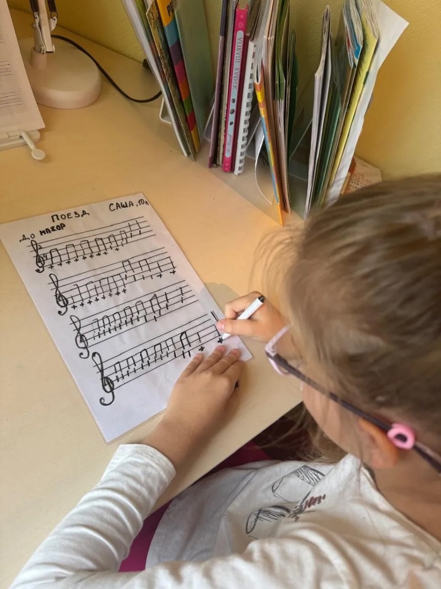 Саша учится во 2 классе общеобразовательной школы, кроме музыки увлекается игрой в настольные игры, занимается нейрогимнастикой и песочным рисованием.