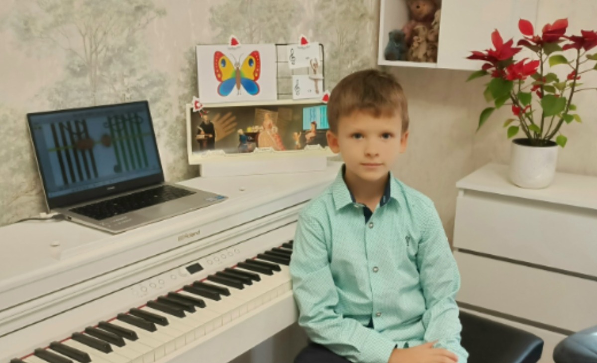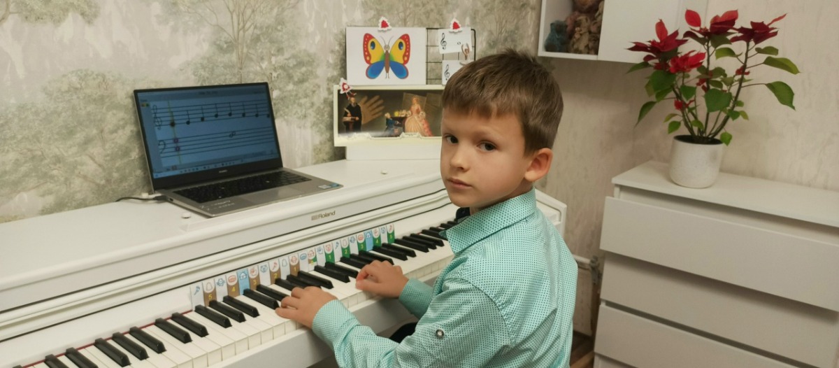 Злата Большая молодец, правильно называет ноты, играет упражнение в расходящемся направлении от разных "до"